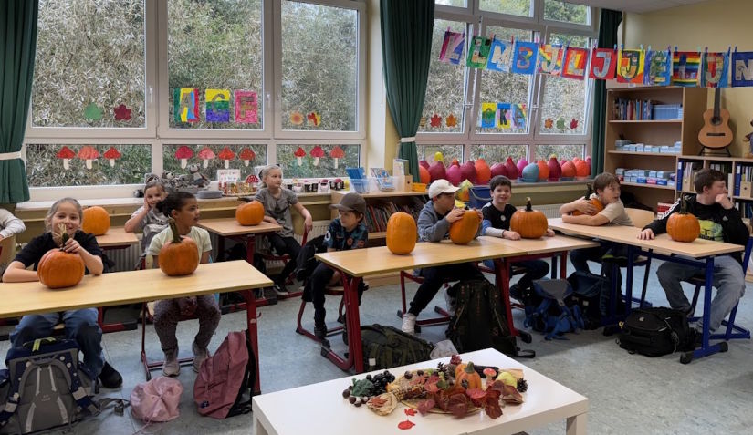 Am 07.10.2025 durften alle Kinder des Jahrgangs 4 am tollen Kürbisschnitzkurs des Dümptener Bauernhofs teilnehmen. Zwei Mitarbeiterinnen des Hofes kamen extra mit dem Traktor angereist und hatten 90 Kürbisse für uns dabei!