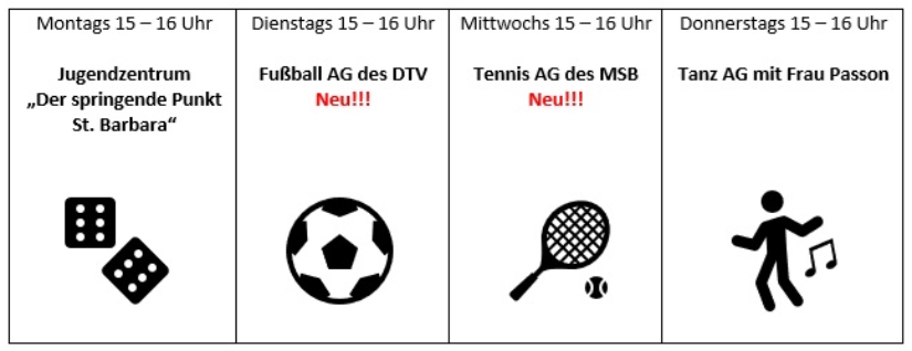 Nach den ersten zwei Terminen haben die Kinder die Möglichkeit, sich noch einmal umzuentscheiden und gegebenenfalls in eine andere AG zu wechseln. Bitte sprechen Sie mich (Frau Volmer) gern diesbezüglich an.