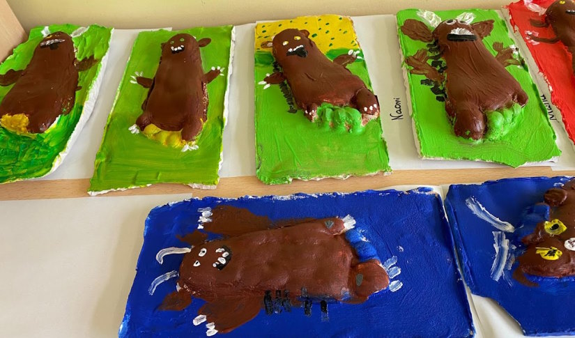 Am vierten Projekttag konnten unsere Fußabdrücke aus Gips sich endlich in Grüffelos verwandeln. Mit Malkittel, Pinsel und Acrylfarbe bewaffnet, ging es los. Alle Grüffelo-Kinder haben sich super viel Mühe gegeben und es sind ganz tolle Fuß-Grüffelos entstanden! 😊